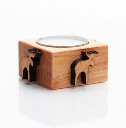 Ljushållare Älg i altträ från Skandinavisk Hemslöjd. Den passar ett vanligt värmeljus och levereras i en presentask med måtten 6,5 x 6,5 x 3 cm och kan även användas som en saltskål.