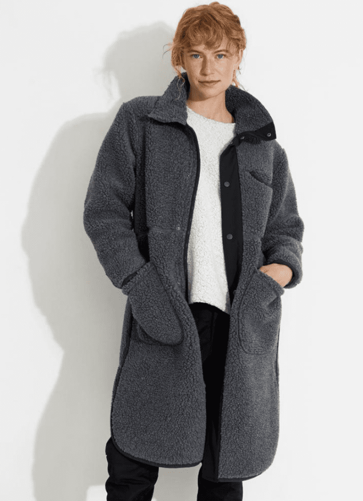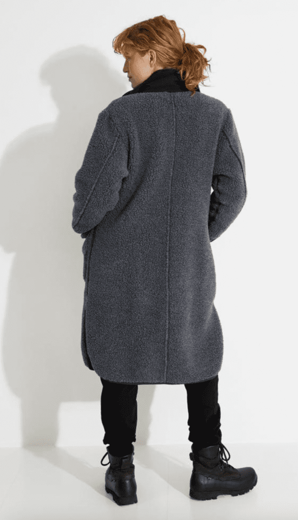 W Koster Lång Ullkappa Grå/Svart från Varg. Denna ullkappa är tillverkad av ett återvunnet bondat pile tyg i ullblandning. Den har synliga sömmar och distinkta detaljer vid frontslå och krage.
