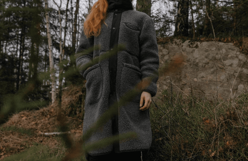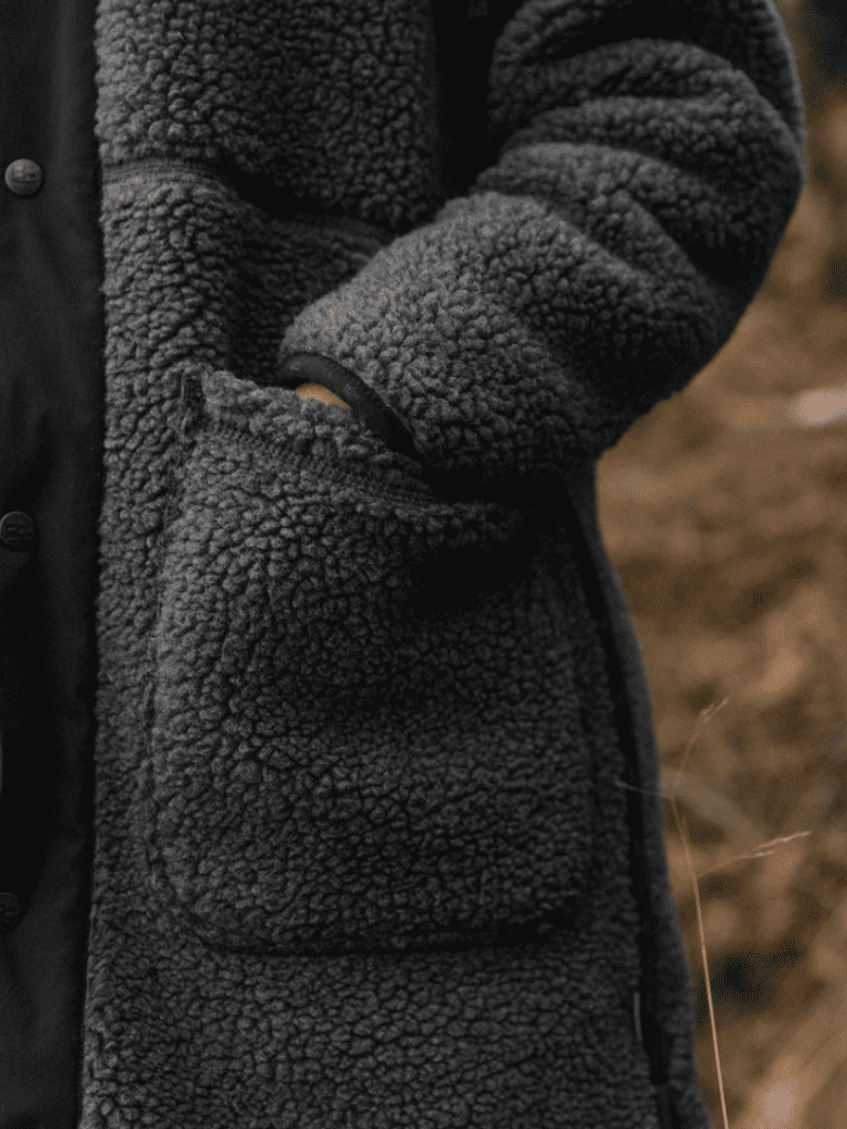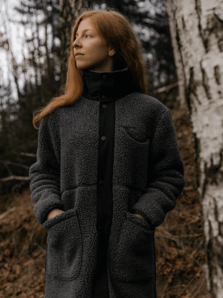 W Koster Lång Ullkappa Grå/Svart från Varg. Denna ullkappa är tillverkad av ett återvunnet bondat pile tyg i ullblandning. Den har synliga sömmar och distinkta detaljer vid frontslå och krage. Med slitsar på båda sidor och två generösa framfickor för att hålla händerna varma är den perfekt för höst och vinter.