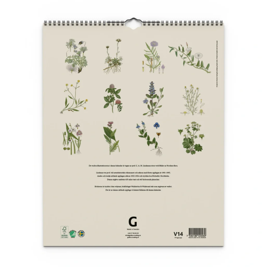 Väggkalender Växter 2025 från Gullers Trading. Väggkalender Växter 2025 med vackra motiv av växter illustrerade av C.A.M. Lindman tillverkade i början av 1900-talet. Kalendern är tryckt på extra tjockt gultonat papper. Tillverkad i Sverige och miljömärkt med svanen och FSC.